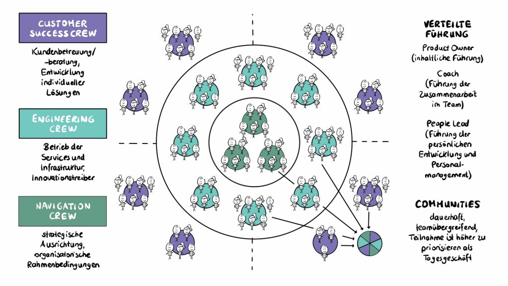 Alle Crews bestehen aus mehreren Teams, die jeweils das organisatorische Zuhause für 4 bis 10 Personen bilden. Inhaltlich geführt wird jedes Team durch einen Product Owner, der das Anforderungsmanagement, die strategische Ausrichtung, die Priorisierung der Arbeitspakete sowie die Wirtschaftlichkeit und das Vorantreiben von Innovation verantwortet.